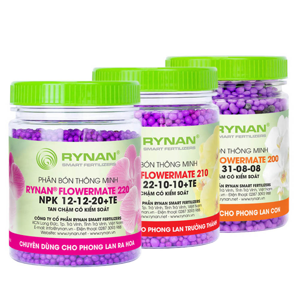 Bộ 03 phân tan chậm có kiểm soát Rynan được sản xuất chuyên dùng cung cấp dinh dưỡng cho hoa lan ở các giai đoạn: giai đoạn lan con, giai đoạn cây lan trưởng thành, giai đoạn kích thích ra hoa.